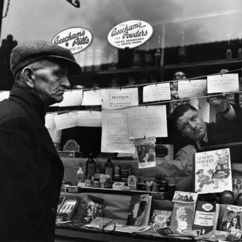 Shopkeeper posts handwritten advertisements in his window following WWII, c-1946